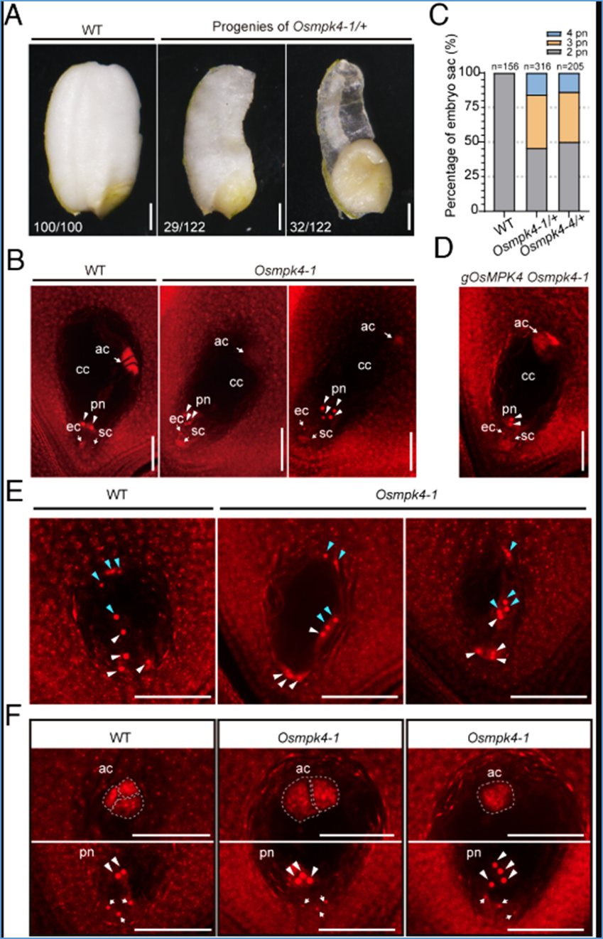 Loss of OsMPK4 leads to supernumerary polar nuclei in the FG. (A) Seed phenotypes of the self-pollinated wild-type plants (Nipponbare, NIP) and Osmpk4-1/+ mutants. The number presented at the bottom of each image shows the counts of aborted seeds (Left) versus the total counts of seeds assessed (Right). (Scale bars, 1 mm.) (B) Morphology of the wild-type and Osmpk4 embryo sacs at the mature stage by the WECLSM method. One or two additional polar nuclei appeared in Osmpk4 embryo sacs. (Scale bars, 50 μm.) (C) Quantitative assessment of varieties of phenotype events in the progenies of Osmpk4/+ mutants according to the number of polar nuclei. pn, polar nuclei. The number of embryo sacs (n) was 156 for wild-type plants, 316 for Osmpk4-1/+, and 205 for Osmpk4-4/+ mutants. d, Expression of OsMPK4Pro: gOsMPK4 complemented the phenotype of multiple polar nuclei in Osmpk4 embryo sacs. (Scale bars, 50 μm.) (E) Morphology of eight-nucleate coenocytes in wild-type plants and Osmpk4-1 embryo sacs. Nuclei derived from the micropylar pole are indicated by white arrowheads, and nuclei derived from the chalazal pole are indicated by blue arrowheads. (Scale bars, 50 μm.) (F) The number of antipodal cell clusters decreased in accordance with the increase in polar nuclei in Osmpk4-1 embryo sacs. (Scale bars, 50 μm.) The dashed frame indicates antipodal cell cluster; arrowheads indicate polar nuclei; arrows indicate egg cells and synergid cells. ac, antipodal cells; cc, central cell; ec, egg cell; pn, polar nuclei; sc, synergid cell.