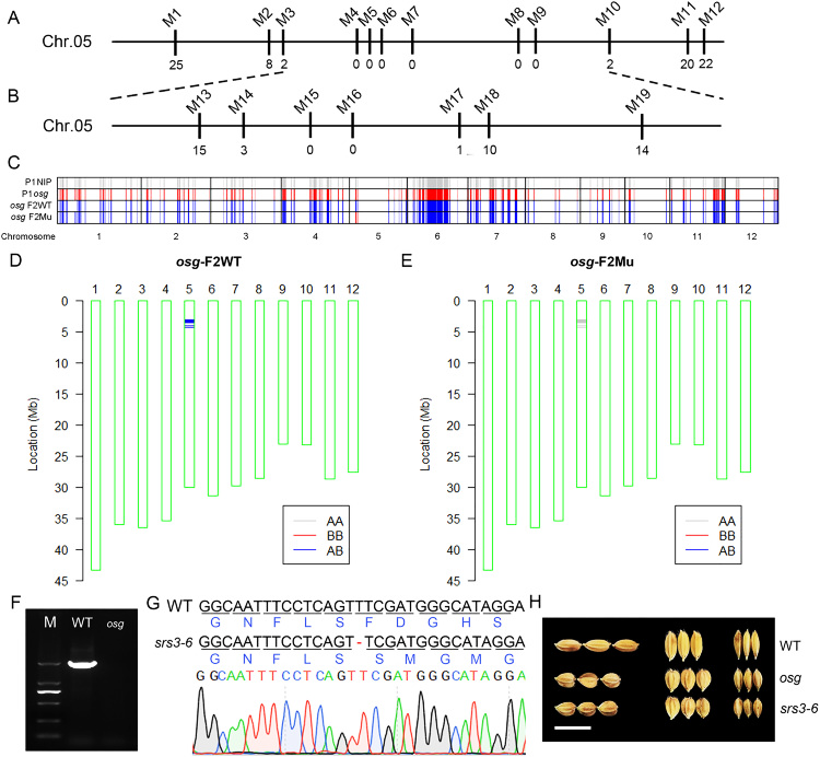 (A) Preliminary localization of the OSG gene using InDel markers M1 and M12 on chromosome 5; (B) Fine mapping of the OSG gene using newly designed InDel markers between M3 and M10, further narrowed down to between M14 and M17; (C) Genotype analysis of parents and F2 pools using SNP chip data; parent osg appears gray (homozygous), parent NIP appears red (homozygous), indicating homozygous genotypes for both parents; (D) SNP analysis at differential loci showing mostly heterozygous genotypes in the WT pool; (E) SNP analysis at differential loci showing homozygous mutant genotype (AA) in the mutant pool; (F) Amplification abnormalities observed in exons 8, 9, 10 and 11 of the SRS3 gene in osg; (G) Identification of a homozygous individual plant srs3-6 with a single-base deletion (T) leading to loss of function in the SRS3 gene; (H) Observation of grain morphology in srs3-6, scale bar = 1 cm.