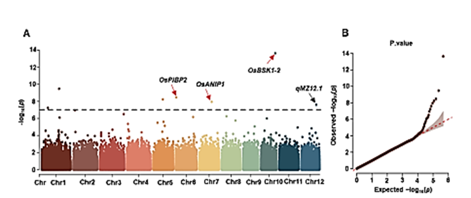 Rice blast, caused by the fungus Magnaporthe oryzae, is one of the most devastating diseases that affects rice production globally. Identifying new QTLs or R genes for blast resistance is crucial for developing rice varieties with enhanced resistance. In this study, a genome-wide association study (GWAS) to identify QTLs associated with blast resistance was conducted using phenotypic and genotypic data from 236 rice accessions. A total seven important QTLs linked to rice blast resistance were identified on chromosomes 1, 5, 6, 7, 10, and 12. Four main QTLs (qMZ6.1, qMZ7.1, qMZ10.1, and qMZ12.1) were key contributors to the blast resistance. Through combined analysis of differential expression and annotations of the predicted genes within qMZ12.1 based on haplotype and disease phenotype, we identified OsCBP606, which encodes a calmodulin protein, as the candidate gene for qMZ12.1. Compared with the wild-type plants, OsCBP606 knockout plants exhibited enhanced resistance to M. oryzae, while OsCBP606 overexpressing plants showed increased susceptibility. These findings highlight the critical role of OsCBP606 in modulating the rice immune response, making it a promising target for breeding programs aimed at improving rice blast resistance.