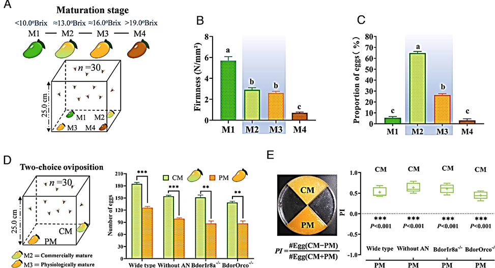 Figure 1: Oviposition preference of B. dorsalis on mango fruits at different maturity levels. (A) Experimental setup for oviposition preference tests using fruits at four stages of maturity (M1–M4) (n = 30). (B) Firmness measurements of fruits at each maturity stage. (C) Oviposition ratio of B. dorsalis on fruits at each maturity stage. (D) Two-choice oviposition assays comparing CM and PM fruits with wild-type (WT) flies, WT + antennal ablation, BdorOrco–/– mutants, and BdorIr8a–/– mutants (n = 30). (E) Two-choice oviposition assays using agar-based mango puree plates prepared from CM and PM fruits, with the same four categories of test insects (n = 8). The preference index (PI) calculation method is shown on the left. Firmness and oviposition ratios (B and C) were analyzed by one-way ANOVA, with significant differences (*P < 0.05) denoted by different lowercase letters (a, b, c). Oviposition frequency and PI (D and E) were analyzed using an independent-samples t test and one-sample t test, respectively.