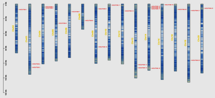 Figure 1: Chromosome density and chromosomal distribution of the AhDUF506 gene. The density of genes on chromosomes is shown by blue-white-spaced stripes, with denser blue indicating denser genes.