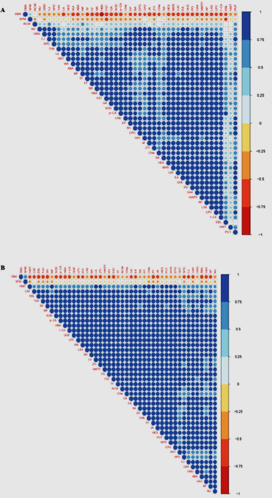 Figure 7: Correlation matrix of physiological traits, biochemical parameters, yield and yield components, hormone profile, phenolic profile, flavonoid profile and polyamine profile of seventeen cashew varieties evaluated under (A ) control and (B) drought stress conditions. DBA: 2,4-dihydroxybenzoic acid, SPM: Spermine, NWT: Nut weight, CAT: Catechin, EBL: Epibrasinolide, Tchl: Total chlorophyll, SR: Sex ratio, MF: Male flower, SOD: Super oxide dismutase, p-CA: p-Coumaric acid, HBA: 3-Hydroxy benzoic acid, t-CA: t-Cinnamic acid, QUE: Quercetin, LPC: Leaf proline content, IAA: 3-Indole Acetic Acid, LSS: Leaf soluble sugar, BA: Benzoic acid, LA: Leaf area, ZTI: Zeatin trans isomer, NWTY: Nut yield, PO: Polyphenol Oxidase, FST: Fruit set, TF: Total flower, RCW: Relative water content, Chl a: Chlorophyll a, GA: Gallic acid, EA: Ellagic acid, SA: Salicylic Acid, EP: Epicatechin, Chl b: Chlorophyll b, FF: Female flower, JA: Jasmonic Acid, HES: Hesperetin, PUT: Putrescine, MYR: Myricetin, EPG: Epigallocatechin, NNT: Nut number, SPD: Spermidine, CJ: Cis-Jasmone, GA4: Gibberellic Acid 4, ORN: Ornithine, ABA: Abscisic Acid, GA3: Gibberellic Acid 3, AP: Ascorbate Peroxidase, MJ: Methyl Jasmonate. The direction of correlation coefficients is indicated with a gradient colour scale on the right side of the figure. Positive correlations are marked with blue colour and negative correlations in red colour; the intensity of colour indicates the strength of correlations. The variables negatively correlated are clustered in the top rows for better visualization.