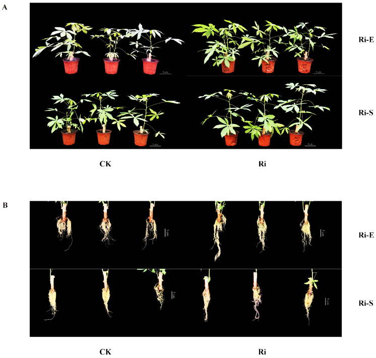 Figure 1: Effects of AMF on cassava growth phenotype. (A). Comparison of overall cassava seedling morphology between CK and AMF groups at early and stable symbiotic stages and (B). comparison of root morphology between CK and AMF groups at early and stable symbiotic stages.