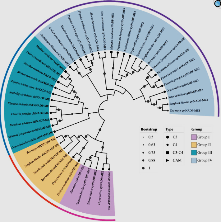 Phylogenetic trees of the NADP-ME family of plants of different photosynthetic types. Different colors represent various groups: Group I (cytosolic monocot types), Group II (plastidic monocot types), Group III (cytosolic eudicot types), and Group IV (cytosolic types shared by monocots and eudicots). Bootstrap values less than 0.5 were concealed.