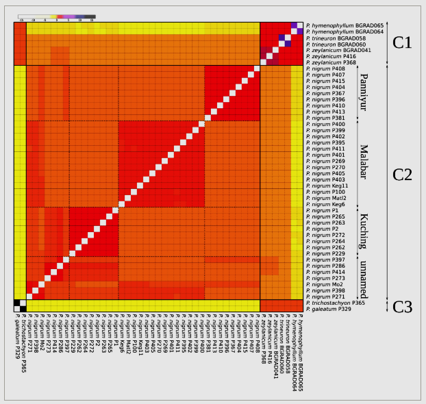 Methods: We analyzed high-quality data comprising single nucleotide polymorphisms (SNPs) using RAxML, a phylogenetic network approach, and coancestry analyses to examine phylogenetic relationships. We included two putative parental species of the hypothesized allotetraploid P. nigrum (P. galeatum and P. trichyostachyon) and a set of Sri Lankan endemic species. We also determined genome sizes of several species.