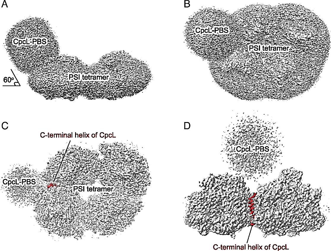 Overall cryo-EM density map of the PSI-CpcL-PBS supercomplex from Anabaena sp. PCC 7120. (A) Side view of the cryo-EM density map of PSI-CpcL-PBS supercomplex, viewed along the membrane plane (threshold level = 0.1, Chimera). (B) Top view of the cryo-EM density map of PSI-CpcL-PBS supercomplex from the stromal side (threshold level = 0.1, Chimera). (C) Top view of the cryo-EM density map of the PSI-CpcL-PBS supercomplex from the stromal side at a higher threshold level (threshold level = 0.2, Chimera). (D) Side view of the cryo-EM density map of the PSI-CpcL-PBS supercomplex, viewed along the membrane plane with an angle different from panel A at a higher threshold level (threshold level = 0.2, Chimera). The C-terminal helix of CpcL is highlighted in brown.